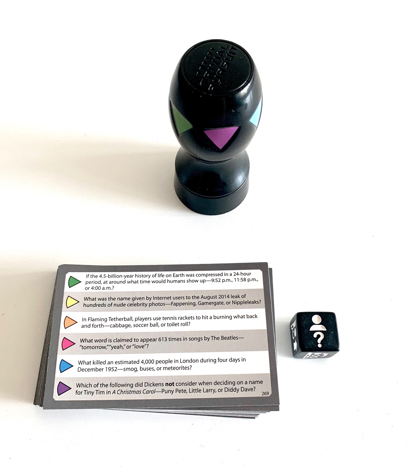 The game comes with seemingly regular Trivial Pursuit cards, These are questions you’d expect from trivial pursuit, they are difficult except this time around they are quirky with a bit of an adult theme.