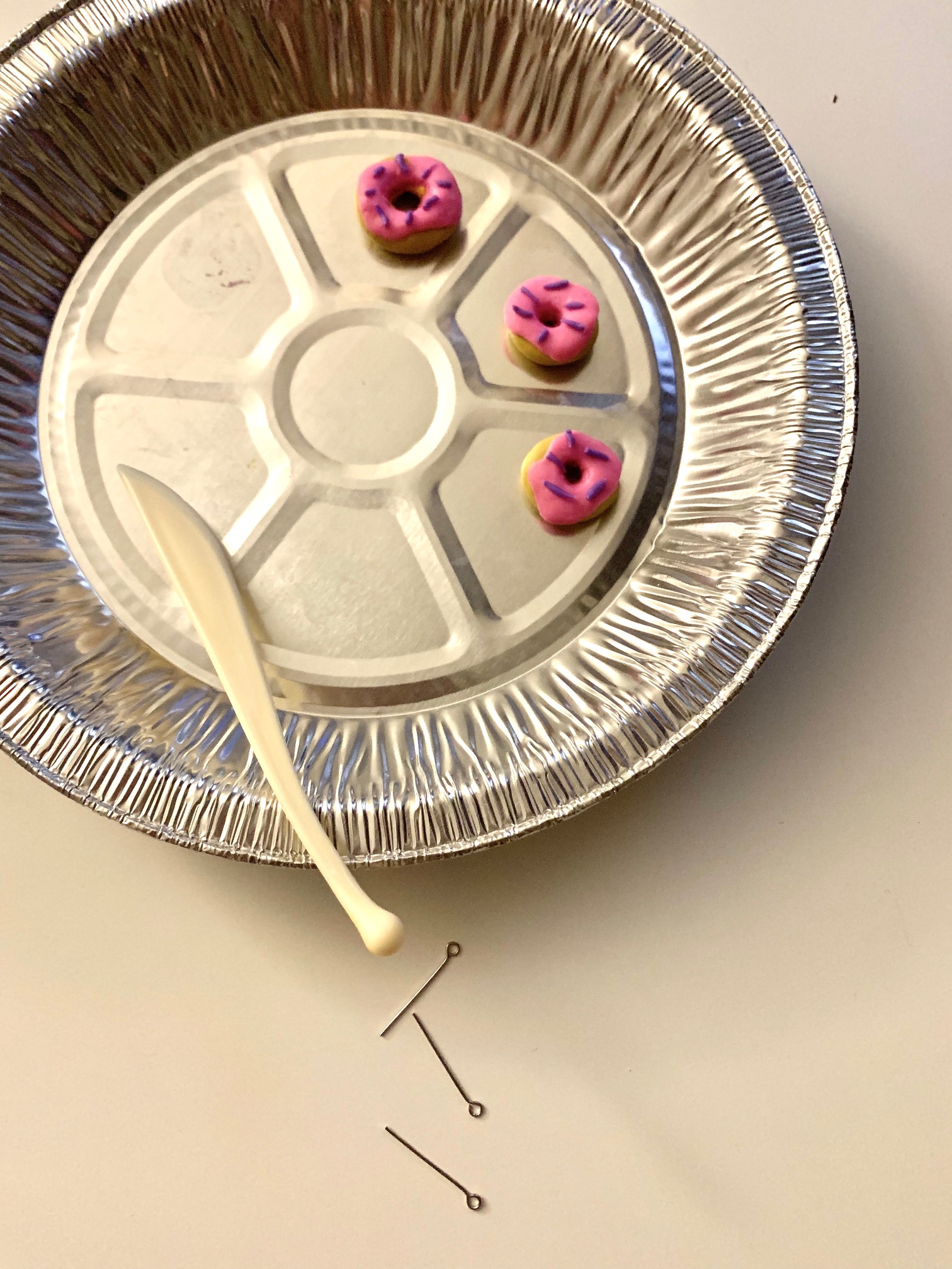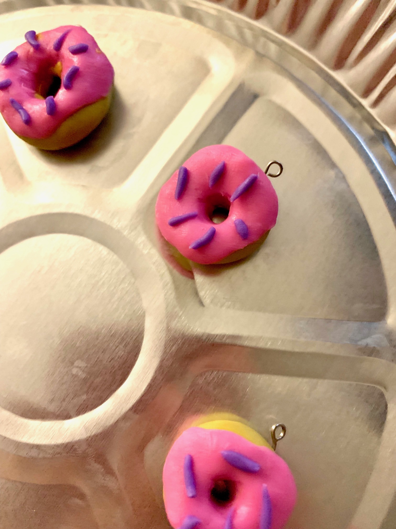 Once the icing was on the donut, I took the tool with the round edge and poked a hole in the middle. After smoothing out where it poked through the bottom I had decent looking little donut. To finish it off, I took some purple clay and rolled it into very tiny little rolls. then cut that into small pieces to act as sprinkles.