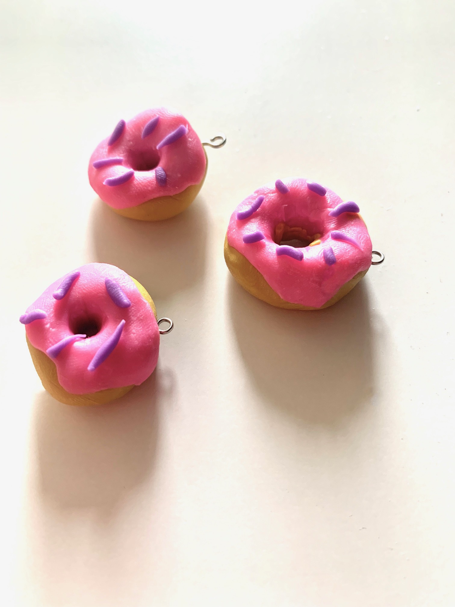 Next I took a small amount of pink clay rolled it into a smaller ball then stretched it out so that it would cover the top of the donut to be the icing. This wasn’t precise in anyway, I wanted the icing to be a bit uneven.