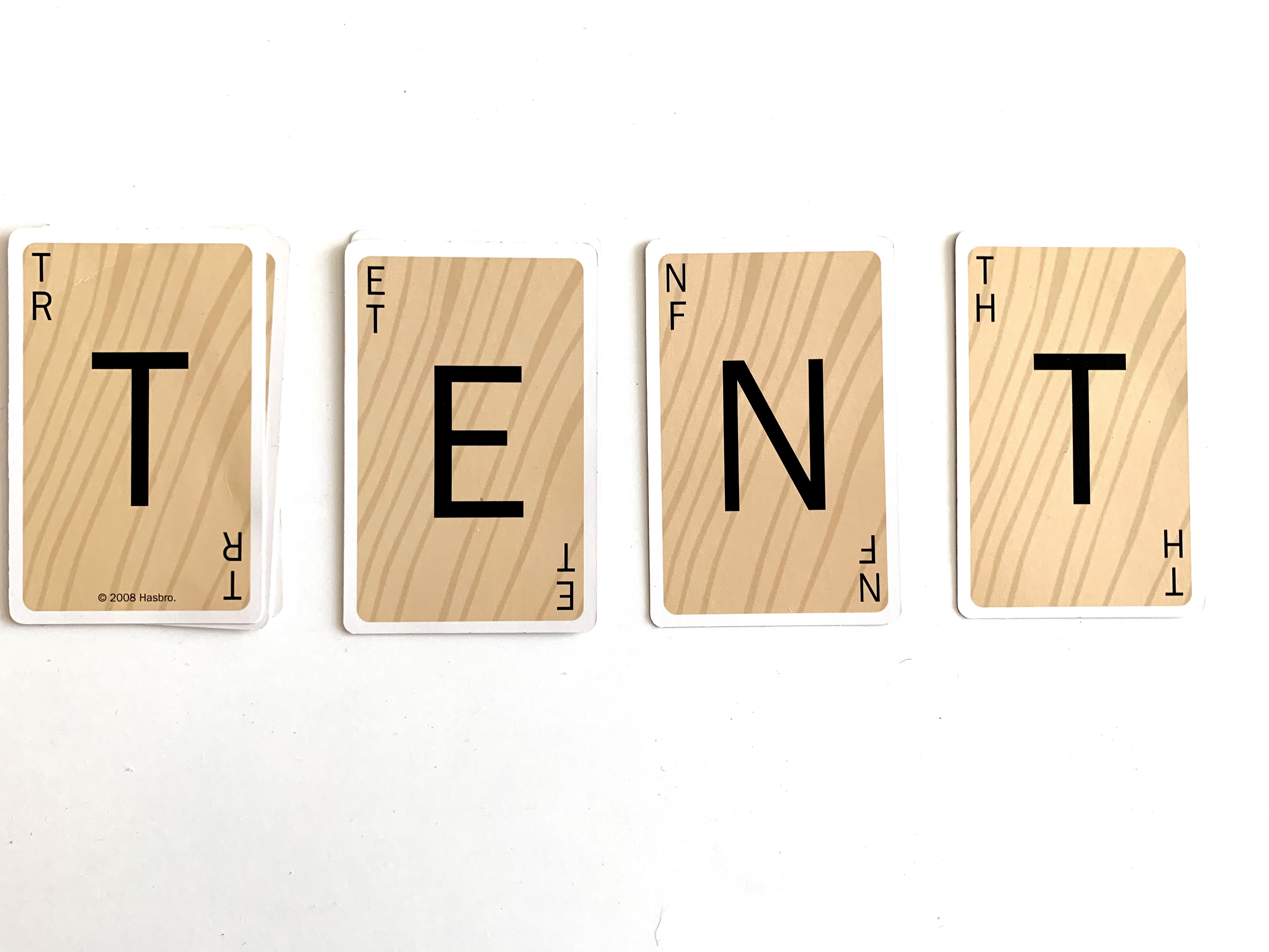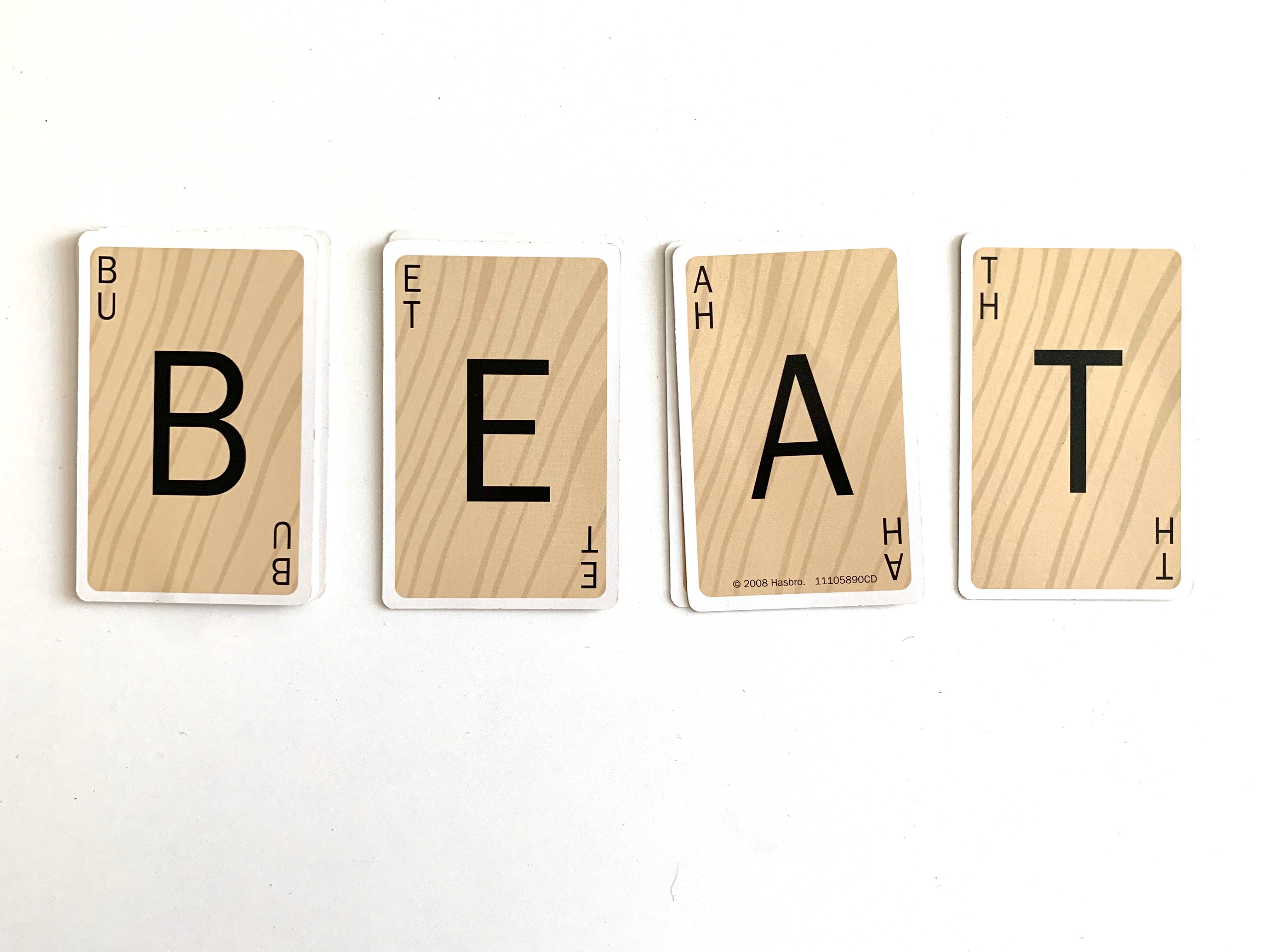 Start the game by saying go. It’s a speed game so there are no turns. Place a card down by using the letter to make a new word. A couple rules to follow:
