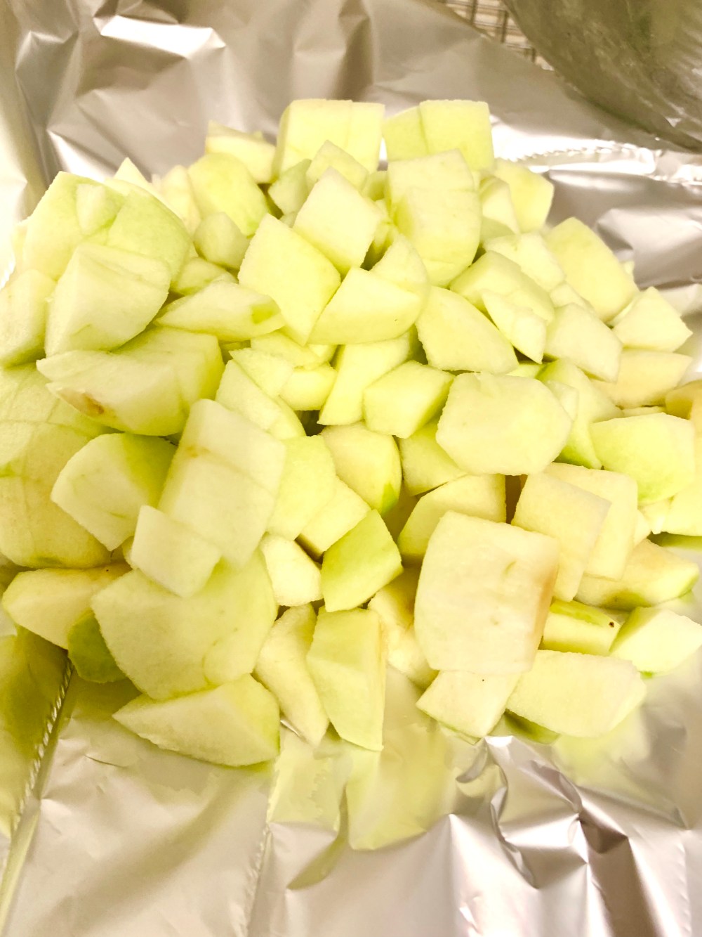 First we peeled and cut the apples into pieces. I cut them fairly small so they’d cook a bit faster. Then packaged a couple apples together in each packet.