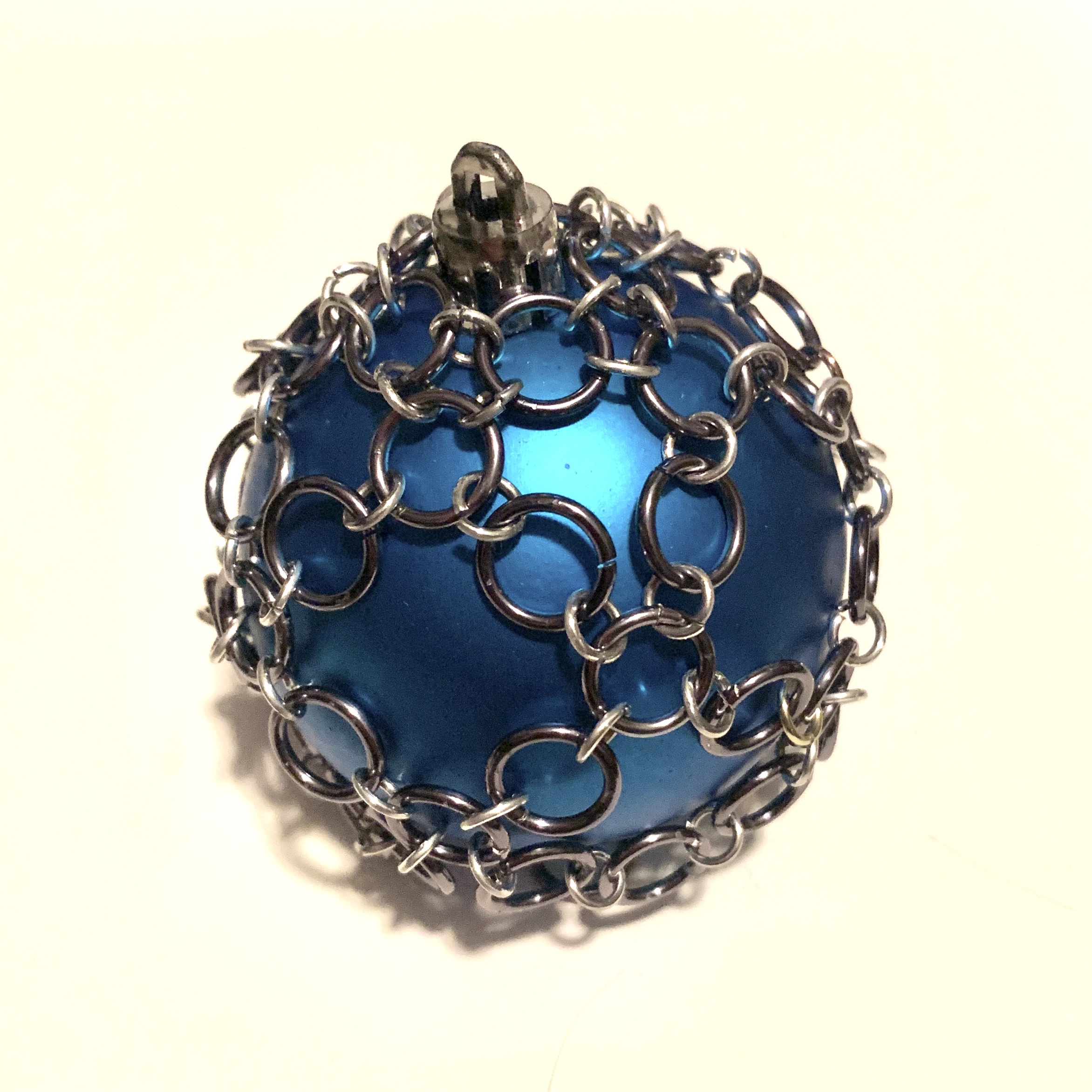 The chain itself is simple. It’s just a pattern of a large ring connected to a small ring, connected to a large ring etc. This allows the large rings to lie flat on the bauble. To start chain together a ring to go around the top of the bauble. Mine was five large rings around. Everything else will be built off of this base.