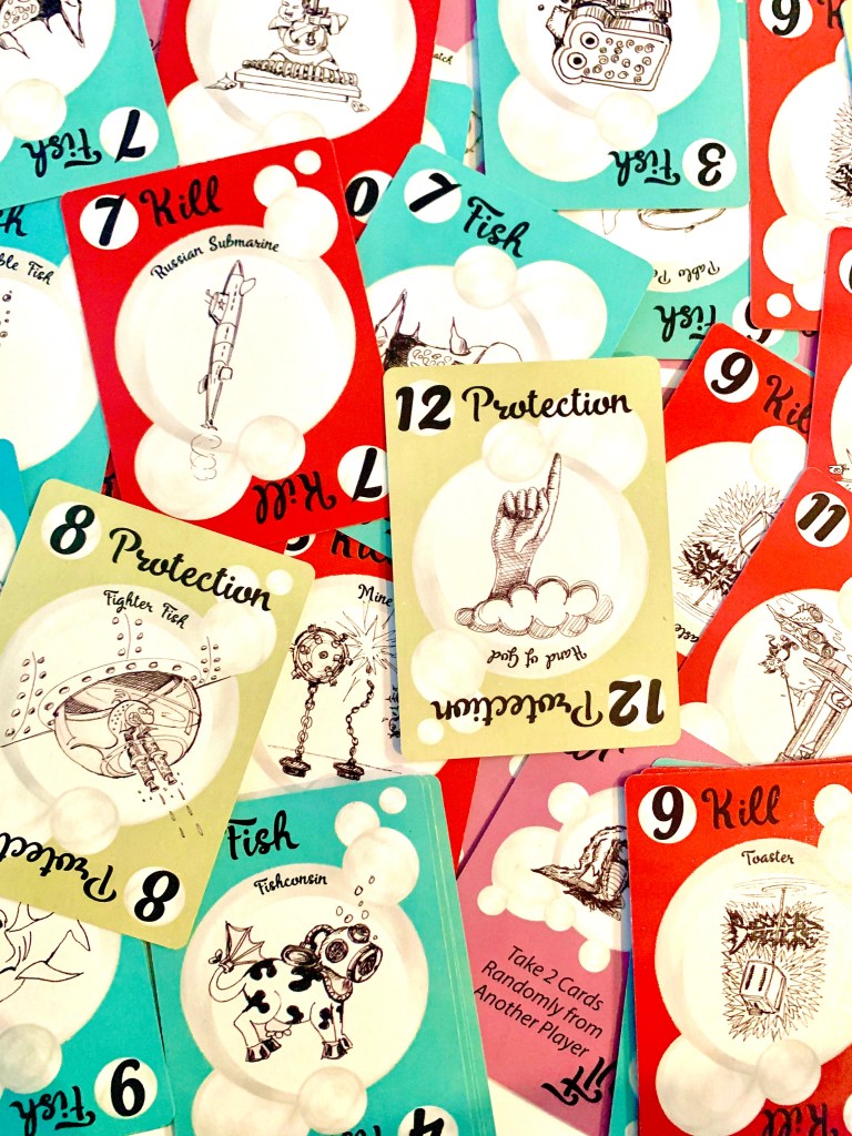 If a player can’t save their fish they say “belly up , my fish is dead” and then any player can play one of their fish and keep playing. If the fish is saved and makes it through alive that player wins.