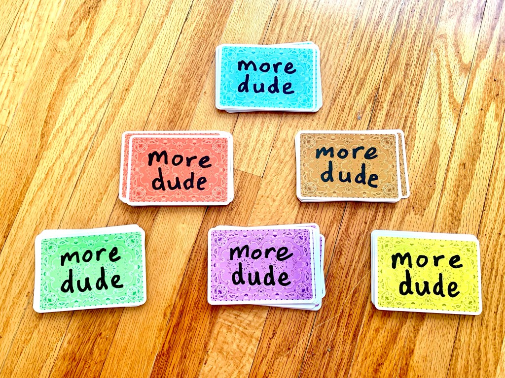 When the game starts everyone will be playing at the same time. Everyone gets their own coloured deck. Shuffle your cards and place them face down. Everyone counts to 3 and turns their entire stack over so they can only see the top card. The only word you are allowed to say in the game is “dude”, so you will say it in a way or accent that represents your card. Keep saying “dude” until you connect with a player you think has the same type of card.