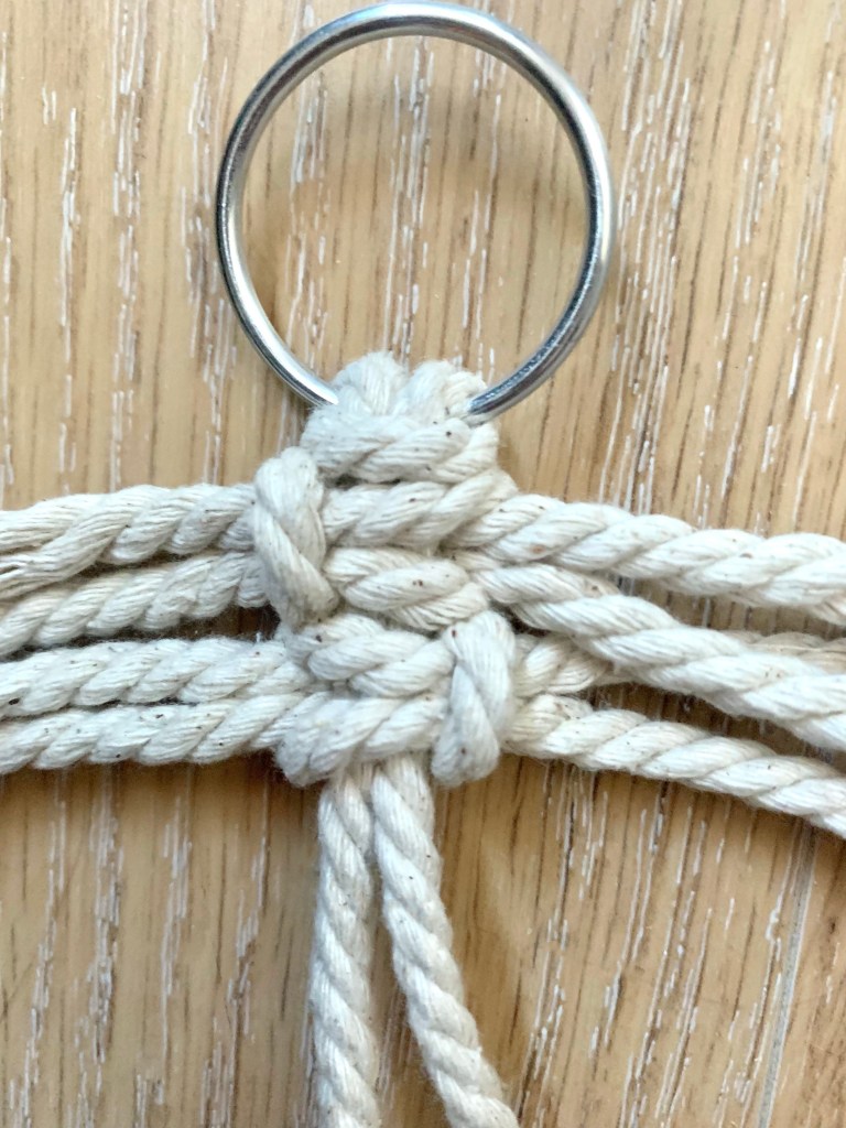 To make this you will need some macrame cord and a metal ring that will fit well with a keyring. The next step is to cut a piece cord double the length you want. Actually I recommend giving yourself a little extra from what you want, you will be trimming this down at the end. For the width, it’s the same thing, cut a few pieces twice the length of the width you want plus a tiny extra for trimming.