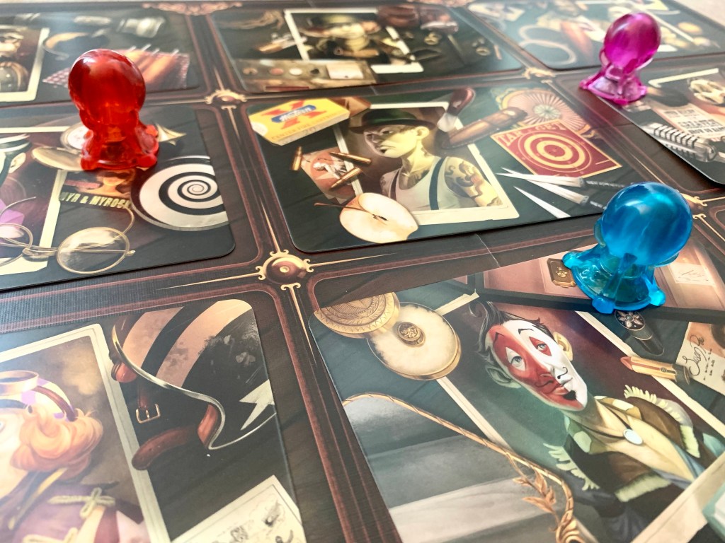 Once all players have received their vision cards, they can discus and start to place their intuition pawns on the card they choose. Once these choices are confirmed, the ghost gets to let the psychics know if they are correct. Comparing to the plot card the ghost will reveal the witness space first. That character card will be discarded and any pawn on that card can be placed on a different card and then other pawns can be moved as well. It’s sort of just a free guess. Once confirmed again the ghost will continue to reveal who is right and who is wrong.