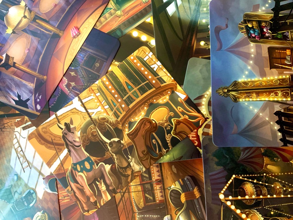 I found it really interesting to have everyone interpret the clues together from the Ghost. We are really trying to get into that players head and their line of thinking. Dixit is similar look and feel except you are on your own trying to figure it out, whereas this is a full discussion with the others players while that “ghost” is listening. Although I like Dixit, I liked the vibe of this better. We were really engaged the entire time, the artwork is amazing and I love that spooky carnival theme. Let’s dive to the game.