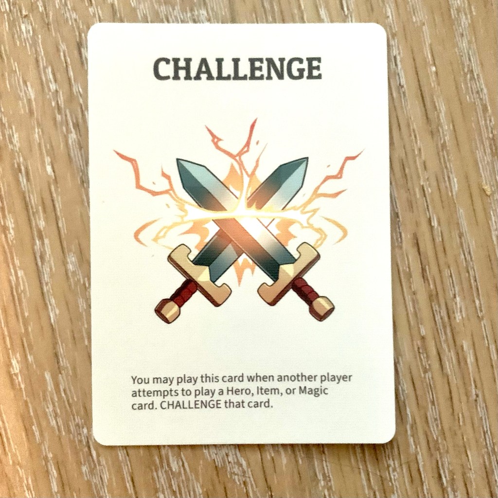Once you have challenged another player, both of you will roll two dice. If your roll is equal or higher, you have stopped that player from playing their Hero, Item or Magic card. The other place must discard the card they wanted to play.