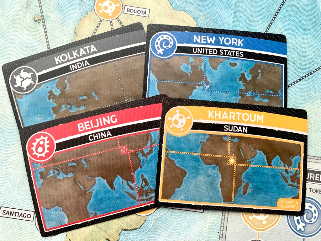 Place the board within reach of everyone on the table. Separate the disease cubes by colour and place them nearby along with the research stations. Place one research station in Atlanta. This is home to the CDC. Research stations are where the diseases will be cured so throughout the game you may want to add more.