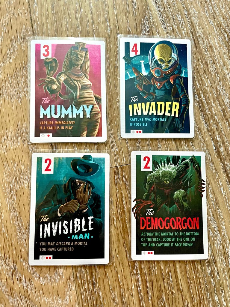 Everyone’s deck will have the same creatures. You will be using them to gain mortals that can be worth negative or positive points over three rounds. Creature cards all have a strength and abilities.