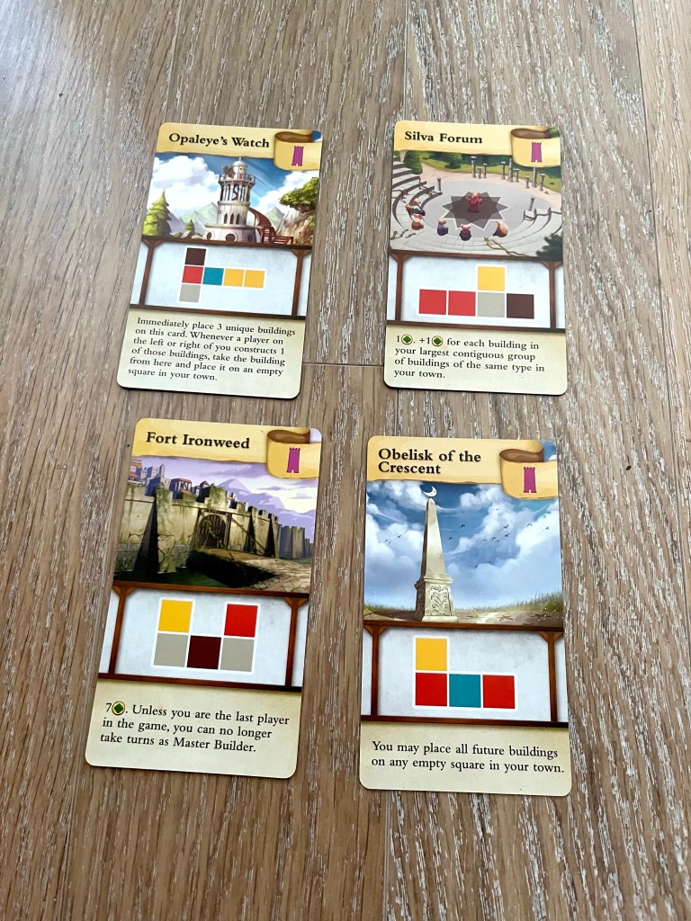 The first player will name a resource and all players must take a cube of this resource and place it on an empty square on their grid. The resource cannot be moved once placed unless to construct a building. Players can construct buildings once they have the matching resources in the right shape on their board. Once everyone’s cube is placed and any buildings are built, the next player will name a resource and the game continues like this.