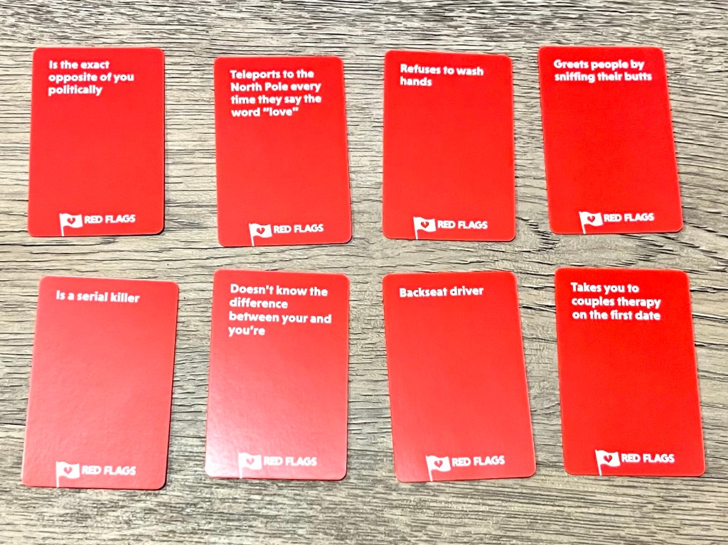 After all the perks have been read, each player picks one of their red flag cards to place on the person on the lefts perks. Read these out as well. The single will need to pick the person they will date, red flag and all. The winning player gets a point and a new player will become the single.