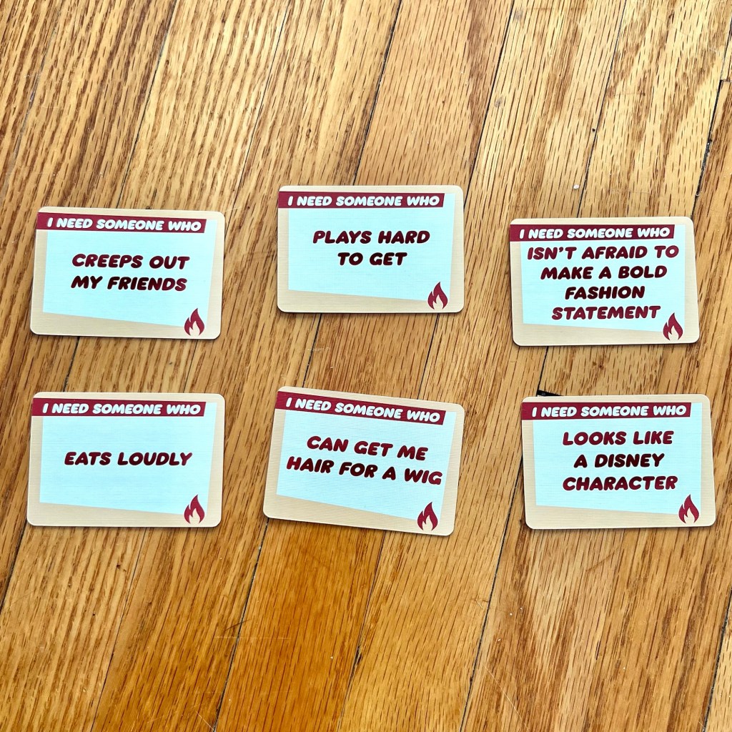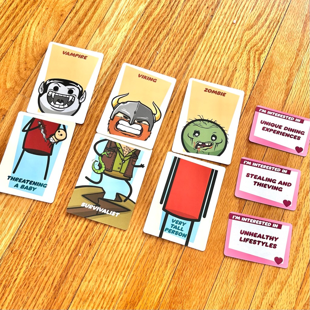 The Sexy Single will flip over the top three interest cards. The Daters will then use their heads and body cards to create a perfect match. Players will keep their choice face down on the table until the reveal. Once everyone is ready, players will one by one turn over their cards and state why their character is best.