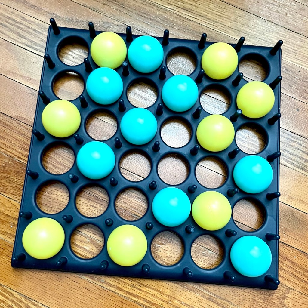 Draw a card for everyone to see. Each card has a different pattern. Take turns bouncing the balls into the tray trying to match the card pattern. If you run out of balls, take one back from the tray and keep going. Once you’ve matched the pattern grab the card. That is worth a point. Start the process over.