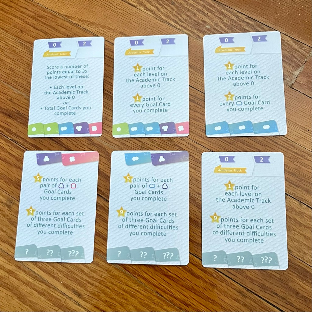 Each player then places their remaining Track Marker on the Academic Achievement Track. The first, second and third players place will be on the 0 spot and the fourth and fifth players will be on the 2 spot.